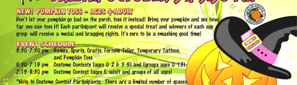 2014 Covina Halloween Carnival! Posted on October 30, 2014 by Yesenia Ruvalcaba-Garcia Looking for a family friendly Halloween event to go to tomorrow? Covina’s Halloween Carnival is at Covina Park tomorrow starting at 5:30pm. Its FREE fun for the whole family! Remember to take pics and tag #CovinaResidents on Instagram! Related articles Covina CA House for Sale! 3 Bedrooms 2 baths, just walking distance to Downtown Covina. Share this: Click to share on X (Opens in new window) X Click to share on Facebook (Opens in new window) Facebook Like Loading... Related